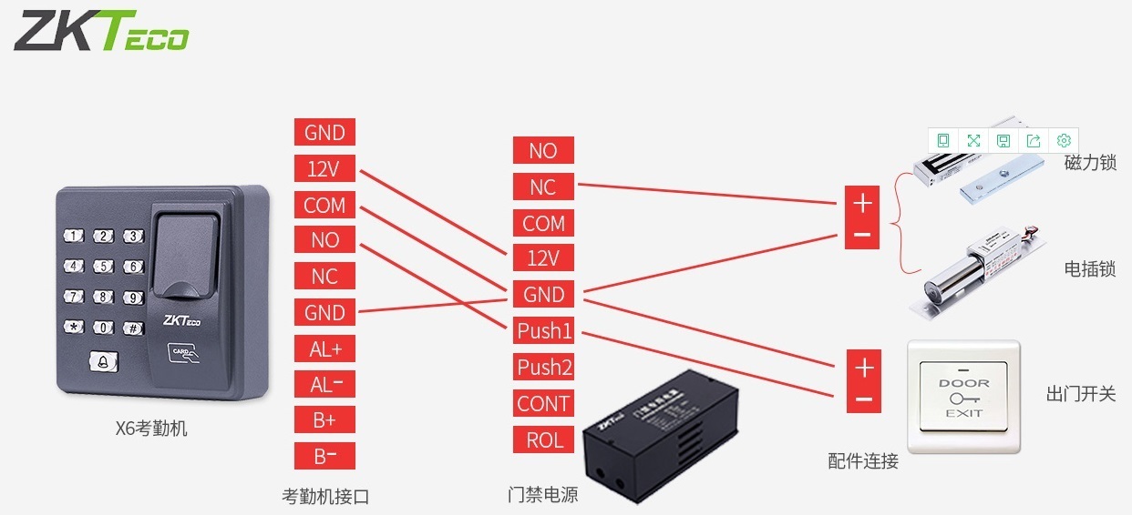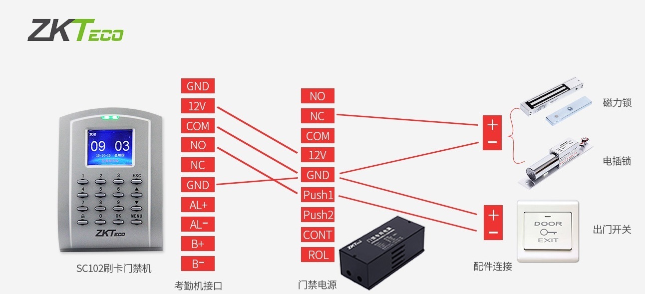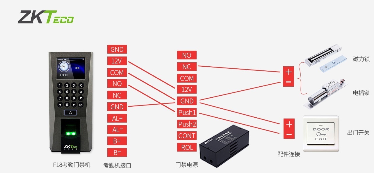 大型聯(lián)網(wǎng)門禁系統(tǒng)接線方法:門禁考勤一體機:GND:接地(接門禁電源的GND);12V:接電源門禁電源的12V,為門禁主機提供12V的電壓;COM:公共端;NO:通電上鎖(接門禁電源的PUSH);NC:斷電開鎖,AL+:警報器正極;AL-:警報器負極;BUT:按鈕;B+:門鈴正極;B-:門鈴負極。